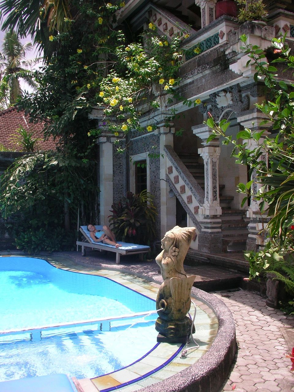 We can't find information about a shuttle bus stop called Perama which is described in Rough Guides and which is supposed to take us to Ubud. After avoiding all the taxi and other 'special' offers we board a local bimo which takes us to Batubulan. There we change for another one which takes us to Ubud. The whole trip takes about 2 hours - heavy crazy traffic all the way. We have a few homestays circled on our book map but we cannot communicate with the driver at all. Luckily a kind local man gets in before Ubud and helps us find one of the addresses. We land in Sania's Homestay in a double bed room with a fan, overlooking a lush garden and a small swimming pool, the use of which we take immediately. After the usual bargaining - Kamila is getting really good at it - one day costs us 80000 Rp including breakfast.