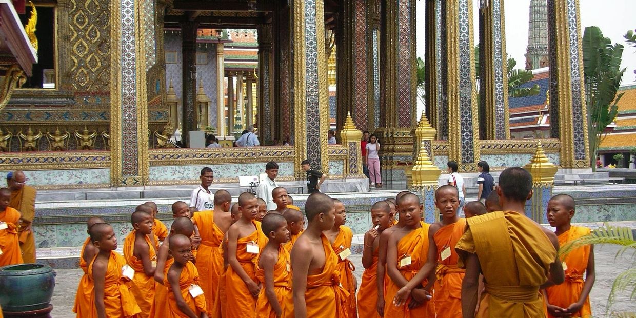 A Skytrain and a boat on Chao Phraya river to Grand Palace, Green Emerald Budda shrine and Wat Pho. To enter the palace grounds you are told to behave and dress decently - elbow length shirts, knee covering pants or skirts and closed shoes - no sandals or flip-flops. In this much over 30 degrees heat, it is a lot to ask. For at least two hours we wander about various bombastically adorned halls, pavilions, buildings with murals, watch changing of the guard ritual. Adjoining the palace is the royal Temple of the Emerald Buddha housing a jade Buddha renowned for its miraculous powers - so it's crowded inside and outside. After taking off our shoes, we follow others, sit on our heels, raise hands in a prayer-like gesture, and watch a group of about thirty young /7- 10 years old/ orange clad monks reciting something after their teacher.
